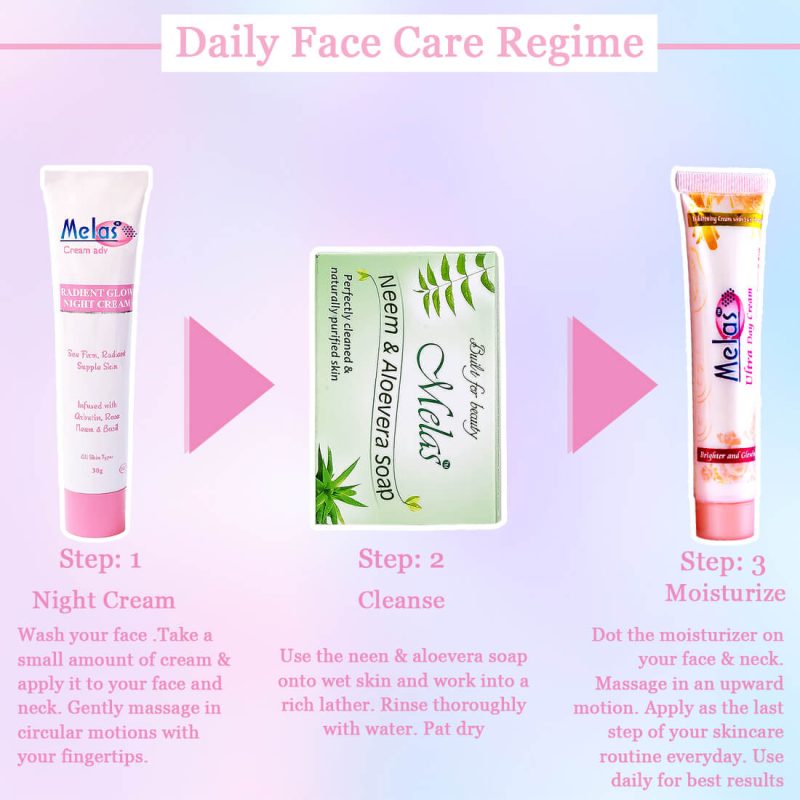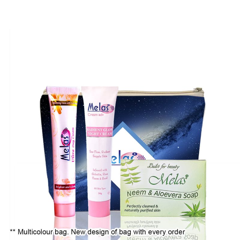 - Package contains :- 1 x night cream, 1 x ultra-day cream, 1 x melas soap x 1 bag kit. This combo is only available with the bag for as low as 20 Rs or for free too based on offers.