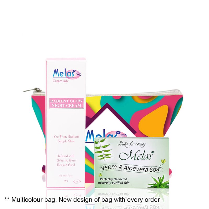 - PACKAGE CONTAINS :- 1 x 75 Gram Melas Soap, 1 Melas Night Cream ( 30 g ) & 1 x Bag. This combo is only available with the bag for as low as 20 Rs or for free too based on offers.