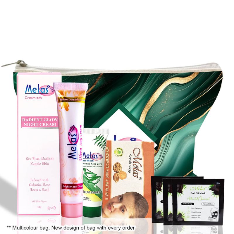 - Now all our premium products in one combo pack. A complete care kit melas skincare essential kit for dull skin packed with nourishment and all the products your skin needs on daily basis.